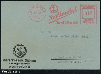 8036 | 15 € | 4600 Dortmund Absender-Freistempel : DORTMUND 1/ ACSG/ Stahlmöbel/ Treeck Söhne AG 1940 (7.3.) AFS Francotyp "Reichsadler" (Monogr.-Logo) motivgl. Firmen-Vorderseite (Dü.E-5CGo) | ![]() | |