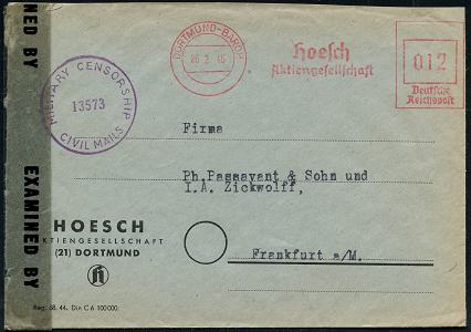 8044 | 28 € | 4600 Dortmund Absender-Freistempel : DORTMUND-BAROP/ Hoesch/ AG 1946 (26.2.) aptierter AFS Francotyp "Reichsadler" = entfernt = Notmaßnahme! (= Metallbetrieb) + viol. US-Zensur-1K: MILITARY CENSORSHIP/13573/ CIVIL MAILS + Klebestreifen: EXAMINED BY (= Offenbach, Rie.A-1, A-101) Inl.-Zensur-Bf. n. Ffm. (Dü.E-13 J-129o) | ![]() | |