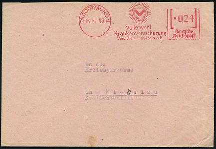 8045 | 22 € | 4600 Dortmund Absender-Freistempel : (21) DORTMUND 1/ V/ Volkswohl/ Krankenversicherung.. 1946 (16.4.) aptierter AFS Francotyp "Reichsadler" = entfernt = Notmaßnahme! (Monogr.-Logo) rs. Abs.-Vordruck (Klappen-Ausriß) Fern-Bf. (Dü.E-13 R-147o) | ![]() | |