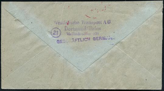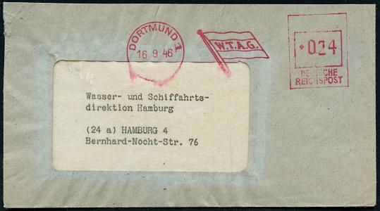 8049 | 20 € | 4600 Dortmund Absender-Freistempel : DORTMUND 1/ W.T.A.G. 1946 (16.9.) aptierter AFS Francotyp Antiqua "Reichsadler" = entfernt = Notmaßnahme! (Reederei-Speditions-Flagge) rs. Abs.-3L: Westfäl. Transport AG/ Dortmund-Hafen.. (Bf. kl. Randriß) Fern-Bf. (Dü.E-14 C-DGo = seltene Type) | ![]() ![]() | |