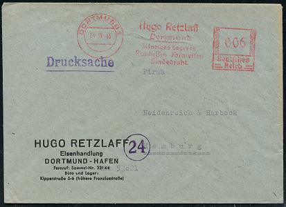 8052 | 35 € | 4600 Dortmund Absender-Freistempel : DORTMUND 1/ Hugo Retzlaff../ Rundeisen Formeisen/ bindedraht 1946 (24.10.) aptierter AFS Francotyp "Hakenkreuz" = entfernt = Notmaßnahme! , Firmen-Fern-Bf.: HUGO RETZLAFF, Eisenhandlung.. (Dü.E-12 M-88o = seltene Type!) | ![]() | |