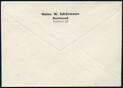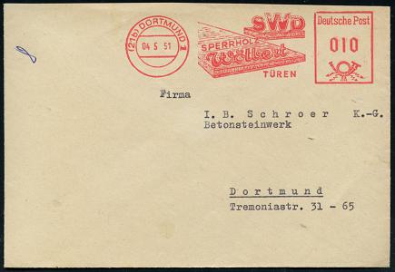 8055 | 16 € | 4600 Dortmund Absender-Freistempel : (21b) DORTMUND 1/ SWD/ SPERRHOLZ/ Wöllert/ TÜREN 1951 (4.5.) dekorativer AFS Francotyp "Posthorn" (Sperrholz-Platten) rs. Abs.-Vordruck, Orts-Bf. (Dü.E-20CG) | ![]() | |