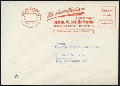 8059 | 16 € | 4600 Dortmund Absender-Freistempel : DORTMUND 1/ Gebühr bezahlt../ ..Holzlieferant/ HEINR.W.SCHÜRMANN/ DORTMUUND-HAFEN.. 1957 (ca.) AFS-Imiitation als Buchdruck = Massen-Drs. , rs. Abs.-Vordruck, Orts-Bf., ungewöhnliche Form! | ![]() ![]() | |