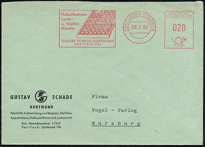8063 | 15 € | 4600 Dortmund Absender-Freistempel : DORTMUND-SCHÜREN/ Kabelrahmen/ Loch-/ u-Waffel-/ Bleche/ GUSTAV SCHADE.. 1962 (6.2.) AFS Francotyp (Waffelblech) Firmen-Bf., seltenes Motiv! (Dü.E-26) | ![]() | |