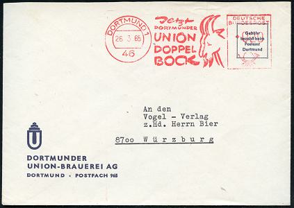 8064 | 15 € | 4600 Dortmund Absender-Freistempel : 46 DORTMUND 1/ Jetzt/ DORTMUNDER/ UNION/ DOPPEL/ BOCK 1965 (26.3.) AFS Francotyp (2 Geißböcke) Firmen-Bf.: DORTMUNDER UNION-BRAUEREI AG.. Gebühr bezahlt.. = Massen-Drs. (Dü.E-23DO) | ![]() | |