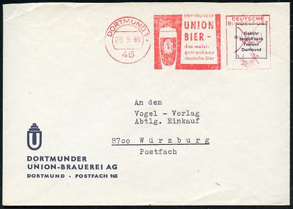 8066 | 14 € | 4600 Dortmund Absender-Freistempel : 46 DORTMUND 1/ DORTMUNDER/ UNION/ BIER.. 1965 (25.5.) AFS Francotyp (Bierglas) Firmen-Bf.: DORTMUNDER UNION-BRAUEREI AG.. (Gebühr bezahlt.. gestrichen) Fern-Bf. (Dü.E-23DO) | ![]() | |