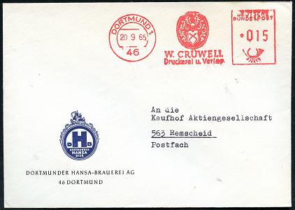 8067 | 15 € | 4600 Dortmund Absender-Freistempel : 46 DORTMUND 1/ W.CRÜWELL/ Druckerei u.Verlag 1965 (20.9.) AFS Francotyp (Firmen-Wappen) auf Firmen-Bf.: DORTMUNDER HANSA-BRAUEREI AG (Dü.E-23DGo = seltene Type) | ![]() | |