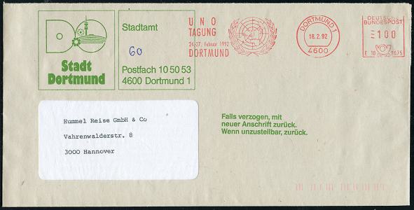 8071 | 15 € | 4600 Dortmund Absender-Freistempel : 4600 DORTMUND 1/ UNO/ TAGUNG/ 24.-27.Februar/ DORTMUND 1992 (Feb.) AFS Pitney-Bowes (UN-Logo) Kommunal-Bf.: Stadt Dortmund.. (Dü.E-26 E, nur kurze Verwendungszeit) | ![]() | |