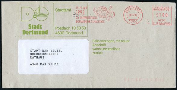 8072 | 15 € | 4600 Dortmund Absender-Freistempel : 4600 DORTMUND 1/ 20.INTERNAT./ DORTMUNDER SCHACHTAGE 1992 (März) AFS Pitney-Bowes mit 2 Schachfiguren (vor Globus) Kommuanl-Bf.: Stadt Dortmund.. (Dü.E-26 E, nur kurze Verwendungszeit) | ![]() | |