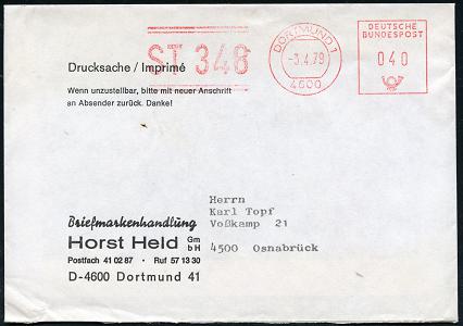 8069 | 15 € | 4600 Dortmund Absender-Freistempel : 4600 DORTMUND 1/ S T 348 1979 (3.4.) AFS "Stielow-Neopost" mit Nummern-Klischee = Probe-Freistempel (für maximal 4 Wochen möglich) Firmen-Bf.: Brieffmarkenhandlung Horst Held.. (Dü.E-26 G, Probefreistempel) | ![]() | |