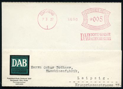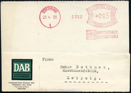 7994 | 25 € | 4600 Dortmund Absender-Freistempel : DORTMUND/ 1/ DBA/ DORTMUNDER/ ACTIENBRAUEREI 1928 AFS Francotyp "Bogenrechteck Urtype" (= weiter Abstand Monat/Jahr) zweifarbige Firmenkt.: DAB.. (Dü.E-1Am, Nr.47) | ![]() | |