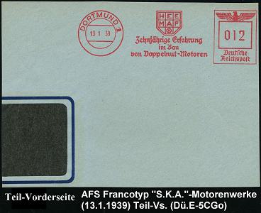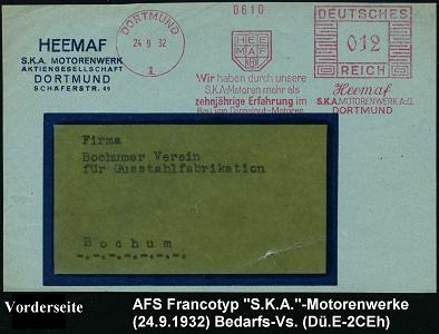 8000 | 25 € | 4600 Dortmund Absender-Freistempel : DORTMUND/ 1/ HEEMAF/ ..S.K.A. MOTORENWERK/ AG.. 1932/39 2 verschiedene AFS Francotyp "Mäanderrechteck" bzw. "Reichsadler" (je Firmen-Logo) Firmen-Vorderseite bzw. Teil-Vorderseite, 2 Belege (Dü.E-2CEh, E-5CGo) | ![]() ![]() | |