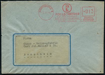 8041 | 25 € | 4600 Dortmund Absender-Freistempel : DORTMUND 1/ POHLSCHRÖDER/ GELDSCHRÄNKE/ STAHL-BÜROMÖBEL.. 1945 (13.11.) aptierter AFS Francotyp "Reichsadler" = entfernt = Notmaßnahme! (Monogr.-Logo) rs. Abs.-3L , Inl.-Bf. (Dü.E-13 R-147o = seltene Type) | ![]() | |