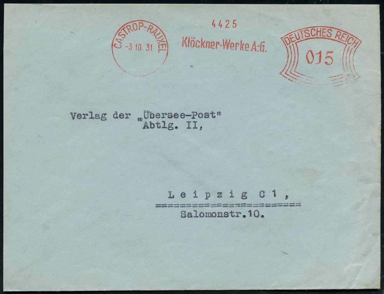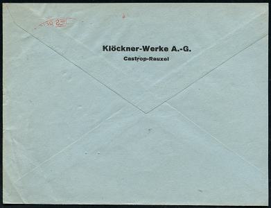 8076 | 20 € | PL-Raum 46.. (ohne Dortmund, Bochum, Gelsenkirchen) : CASTROP-RAUXEL/ Klöckner-Werke A,-G. 1931 (3.10.) AFS Francotyp "Bogenrechteck" , rs. Abs.-Vordruck, Fern-Bf. (Dü.E-1CEh) | ![]() ![]() | |