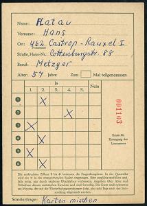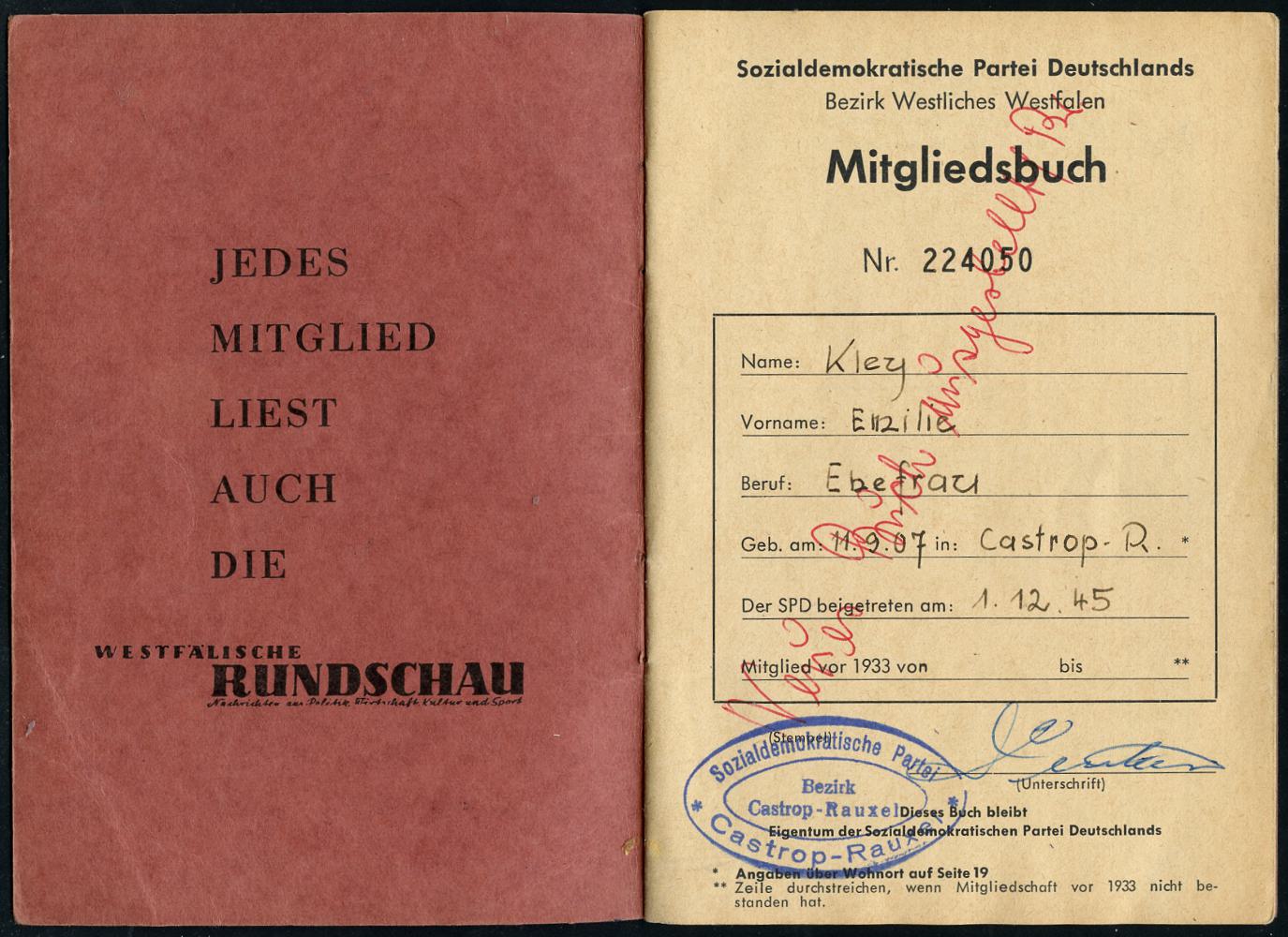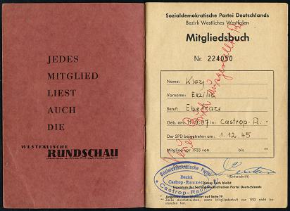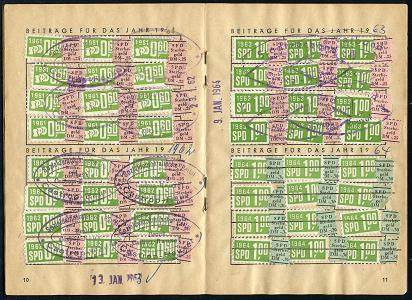 8078 | 25 € | PL-Raum 46.. (ohne Dortmund, Bochum, Gelsenkirchen) : Castrop-Rauxel 1949 SPD-Mitgliedsbuch m.zahllosen Beitragsmarken (grün!) bis 1971 inkl. Willy Brandt Wahl-Spenden-Marke 2 .- DM + 2 Falken-Spendenmkn, | ![]() ![]() ![]() ![]() | |