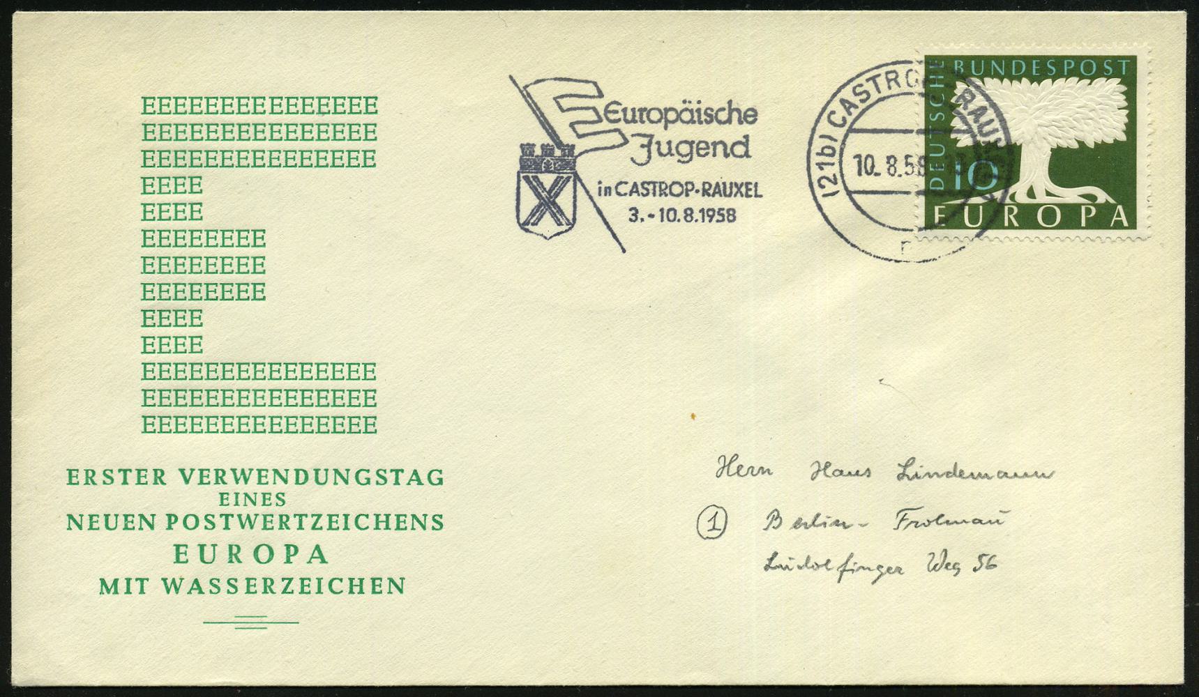 8079 | 15 € | PL-Raum 46.. (ohne Dortmund, Bochum, Gelsenkirchen) : (21b) CASTROP-RAUXEL 1/ n/ Europäische/ Jugend/ ..3.-10.8. 1958 (10.8.) MWSt = alte Europa-Flagge (u. Stadtwappen) auf EF 10 Pf. Europa (Mi.268) Inl.-Europa-SU. (Bo.8 A) | ![]() | |