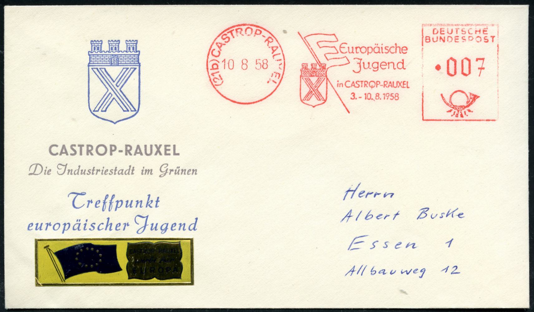 8081 | 15 € | PL-Raum 46.. (ohne Dortmund, Bochum, Gelsenkirchen) : (21b) CASTROP-RAUXEL/ Europ./ Jugend/ ..3.-10.8. 1958 (10.8.) AFS Francotyp (Wappen, alte Europa-Flagge) + goldene Europa-Vign. (neue Europa-Flagge), Inl.-Sonderumschlag (Dü.E-23DG) | ![]() | |