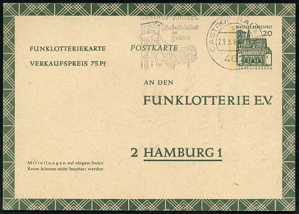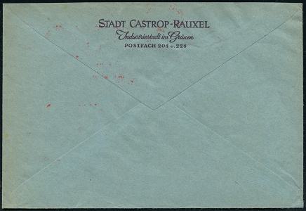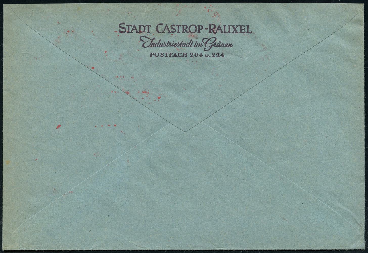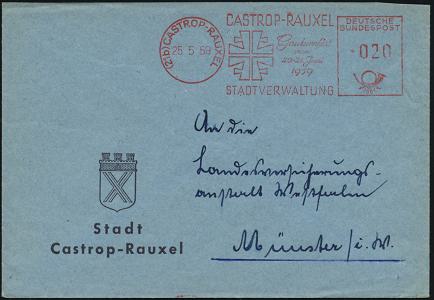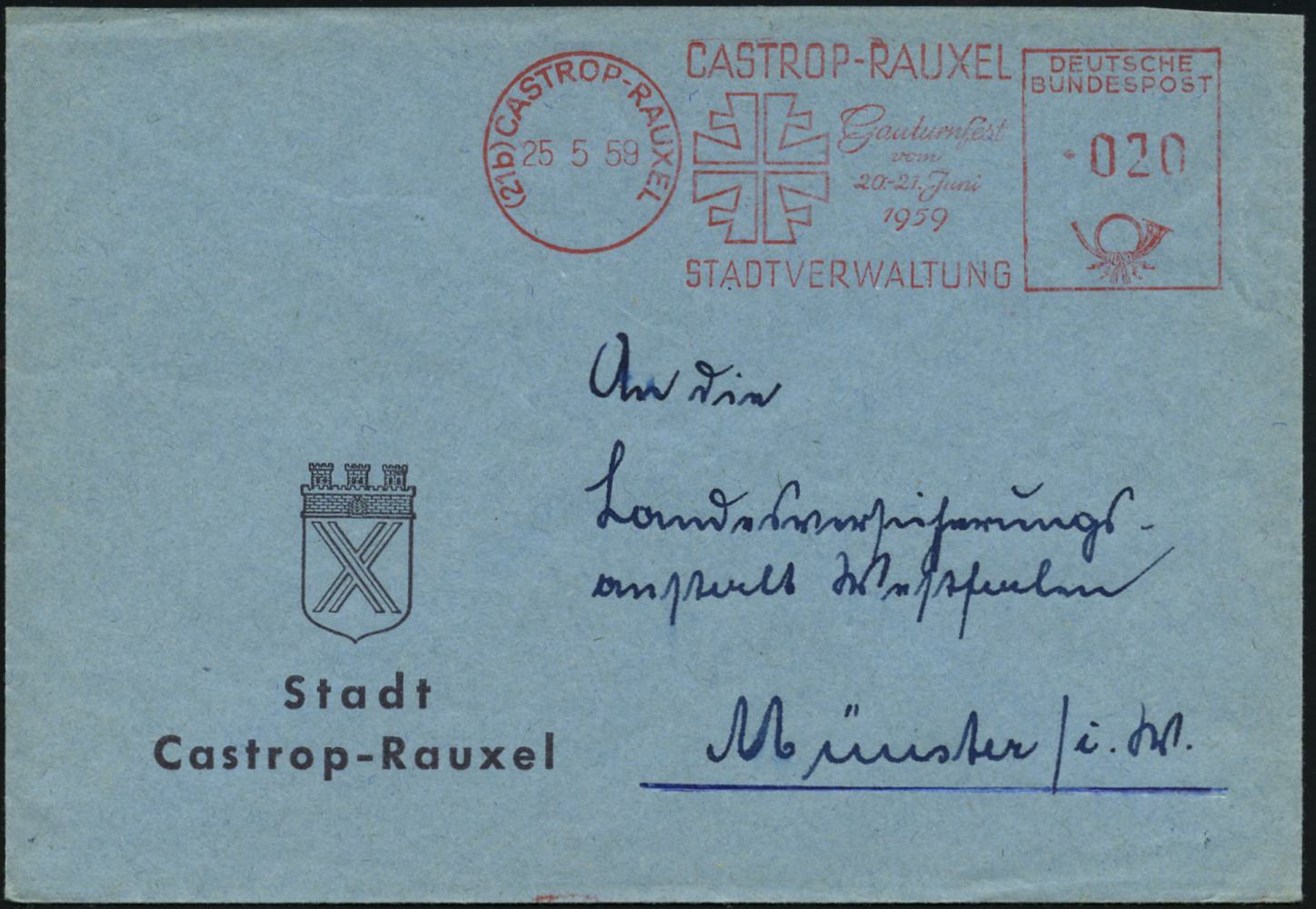 8082 | 16 € | PL-Raum 46.. (ohne Dortmund, Bochum, Gelsenkirchen) : (21b) CASTROP-RAUXEL/ Gauturnfest/ v./ 20.-21.Juni/ STADTVERWALTUNG 1959 (25.5.) AFS Francotyp (Monogr."FFFF") kommunale Dienst-Bf. mit Stadtwappen (Dü.E-23DGo) | ![]() | |