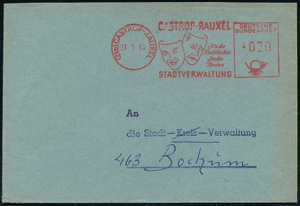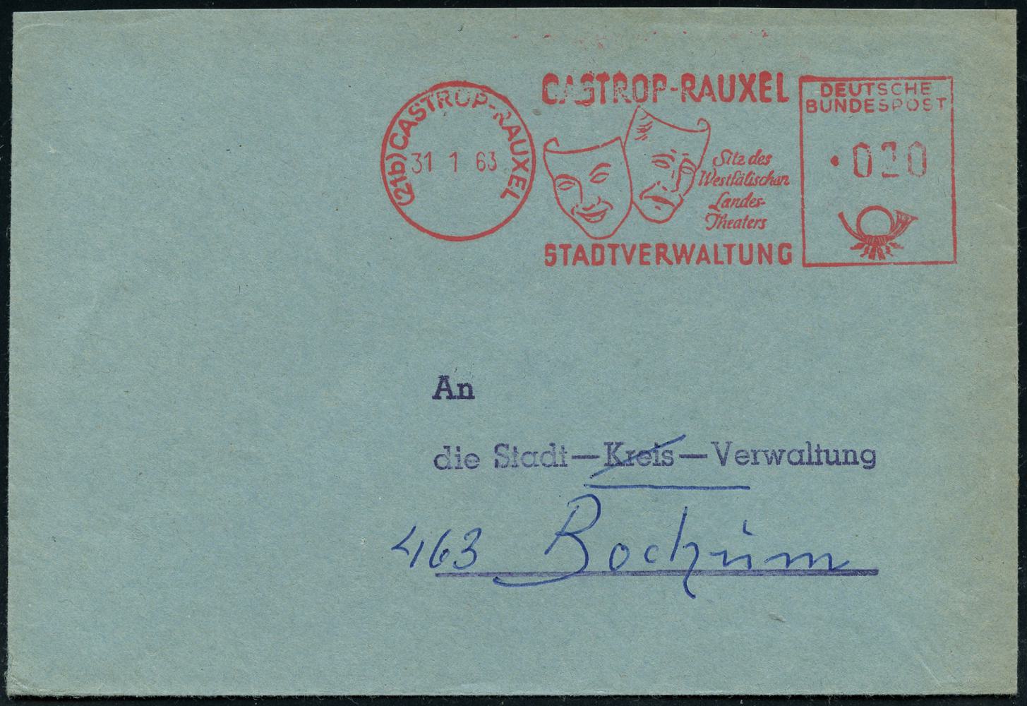 8084 | 12 € | PL-Raum 46.. (ohne Dortmund, Bochum, Gelsenkirchen) : (21b) CASTROP-RAUXEL/ ..Westfäl./ Landes-/ Theater/ STADTVERWALTUNG 1961 (31.1.) AFS Francotyp (komische u.tragische Maske) rs. Abs.-Vordruck: STADT CASTROP-RAUXEL, Jndustriestadt im Grünen.. (Dü.E-23DG) | ![]() ![]() | |