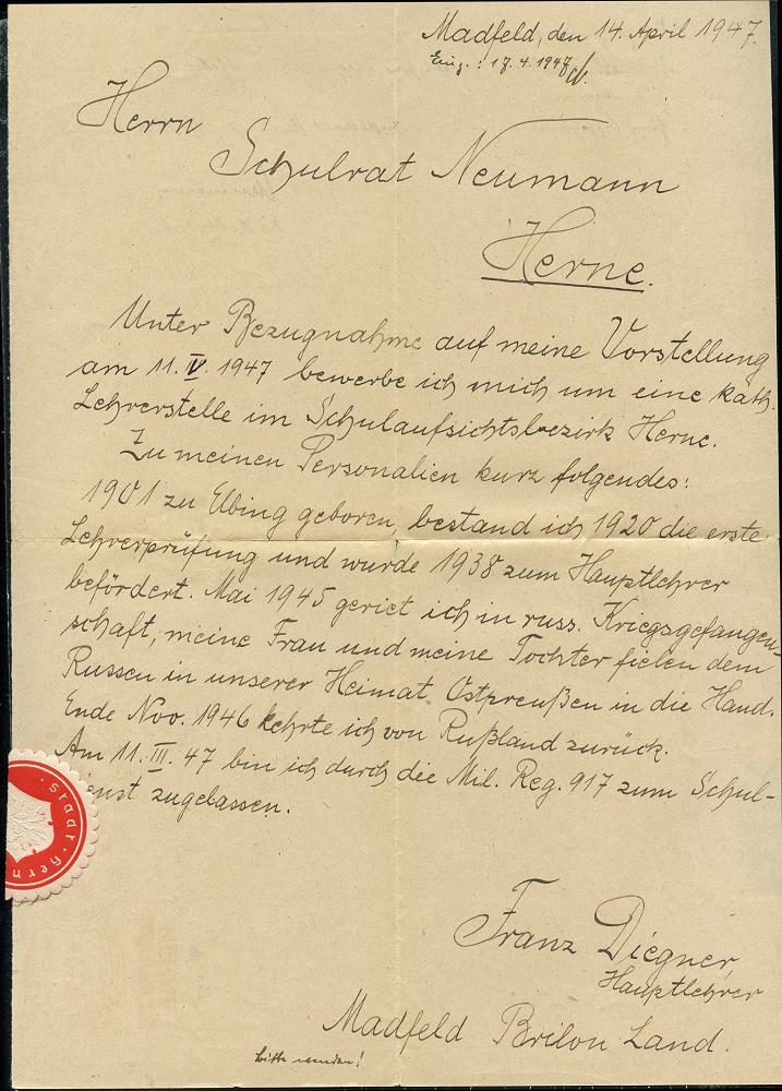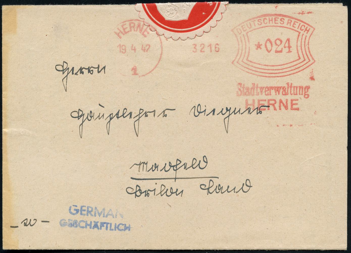 8088 | 25 € | PL-Raum 46.. (ohne Dortmund, Bochum, Gelsenkirchen) : HERNE/ 1/ Stadtverwaltung 1947 (19.4.) AFS Francotyp "Bogenrechteck" unverändert weiterverwendet = Notmaßnahme! , Falt-Bf. mit Inhalt: Bewerbung eines Lehreres, aus Rußland zurückgekehrt n. Brilon (Dü.E-1Am unverändert) | ![]() ![]() ![]() | |