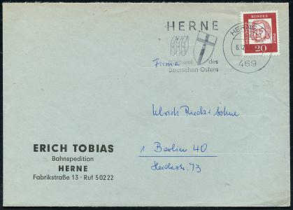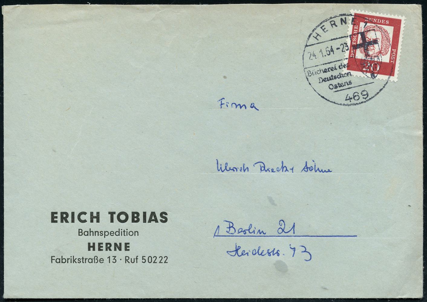 8094 | 10 € | PL-Raum 46.. (ohne Dortmund, Bochum, Gelsenkirchen) : 469 HERNE 1/ Bücherei des/ Deutschen/ Ostens 1964 (24.1.) HWSt = Kreuzritterschild (+ Bücher) Firmen-Bf.: ERICH TOBIAS.. (Bo.13) | ![]() | |
