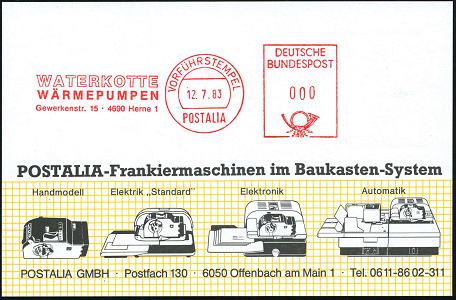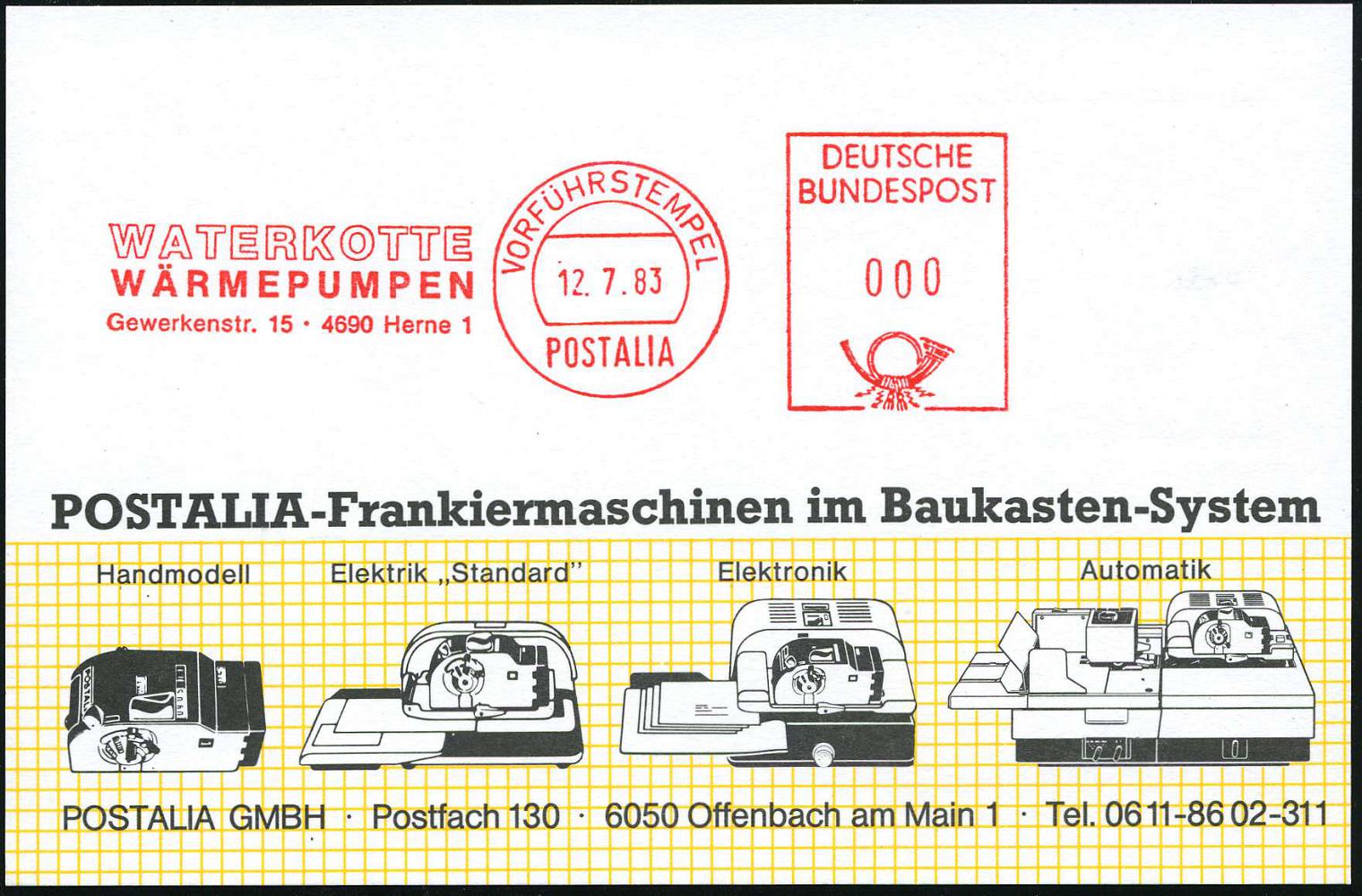 8095 | 18 € | PL-Raum 46.. (ohne Dortmund, Bochum, Gelsenkirchen) : 4690 Herne 1 1983 (12.7.) AFS: VORFÜHRSTEMPEL/POSTALIA/WATERKOTTE/WÄRMEPUMPEN.. , seltene Postalia- Musterkt.! (= Specimen) | ![]() | |