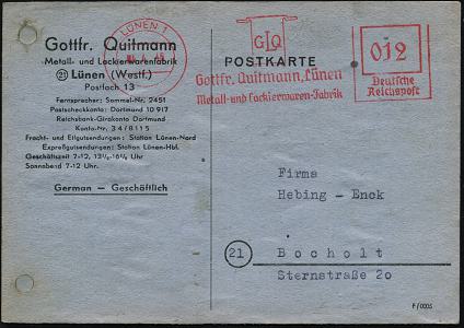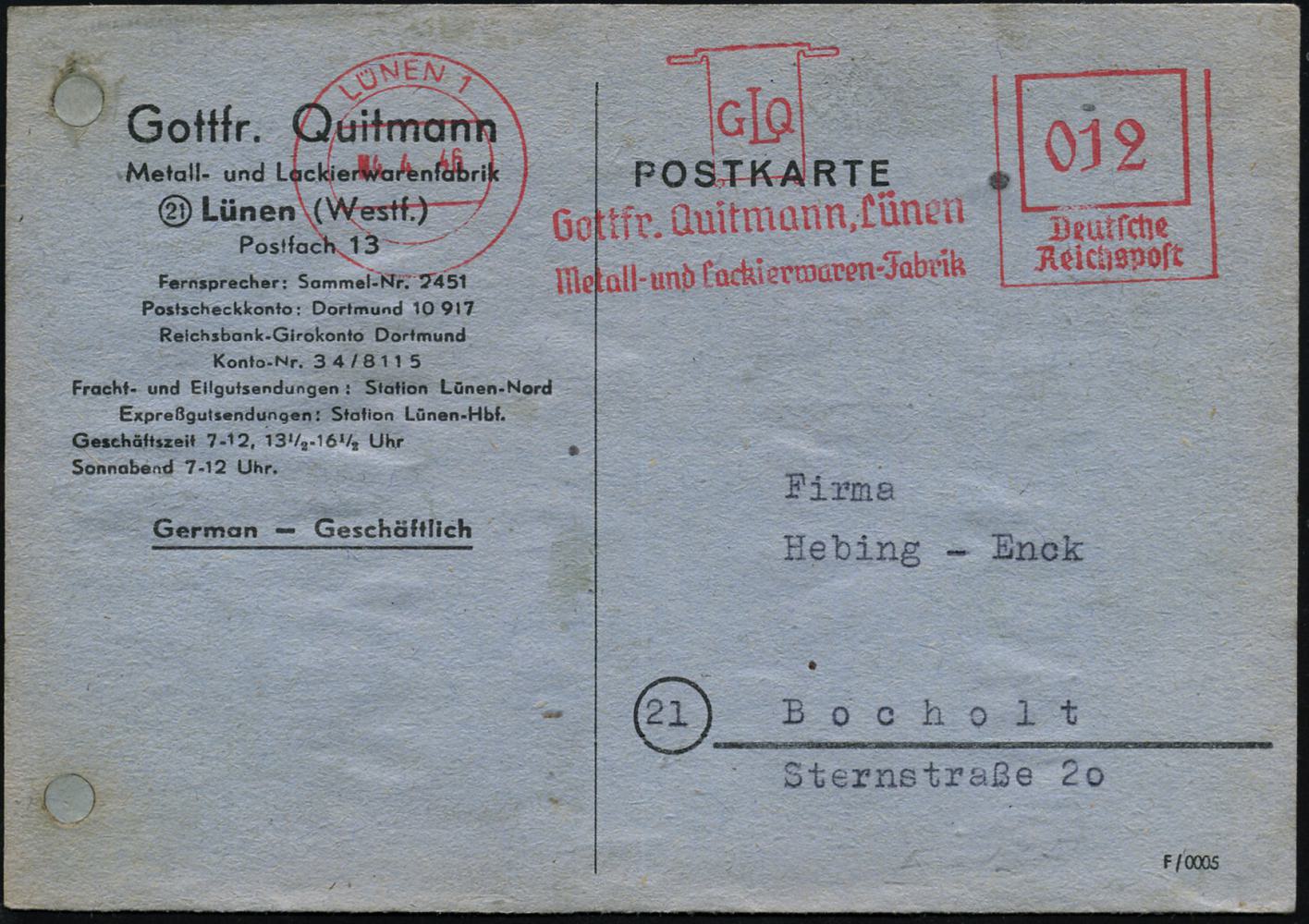 8099 | 20 € | PL-Raum 46.. (ohne Dortmund, Bochum, Gelsenkirchen) : LÜNEN 1/ GLQ/ Gottfr.Quitmann../ Metall-u.Lackierwaren-Fabrik 1946 (4.4.) seltener, aptierter AFS "Reichsadler"= entfernt = Notmaßnahme! (Monogr.-Logo) Firmenkt. (rs.Tesa-Spuren, Reg.-Lochung geschl.) n. Bocholt (Dü.E-13F-107o = seltene Type) | ![]() | |