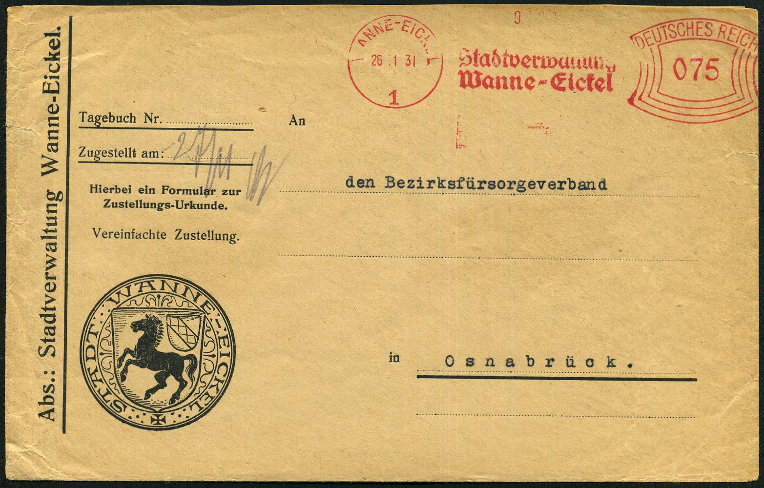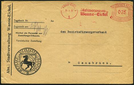 8104 | 25 € | PL-Raum 46.. (ohne Dortmund, Bochum, Gelsenkirchen) : WANNE-EICKEL/ 1/ Stadtverwaltung 1931 (26.1.) AFS Francotyp "Bogenrechteck" 075 Pf. auf Kommunal-Bf.: Zustell-Urkunde Vereinfachte Zustellung (Stadtwappen, 2x kl. Riß geschl.) Fern-Post-ZU. n. Osnabrück, seltene Portostufe (Dü.E-1CEh) | ![]() | |