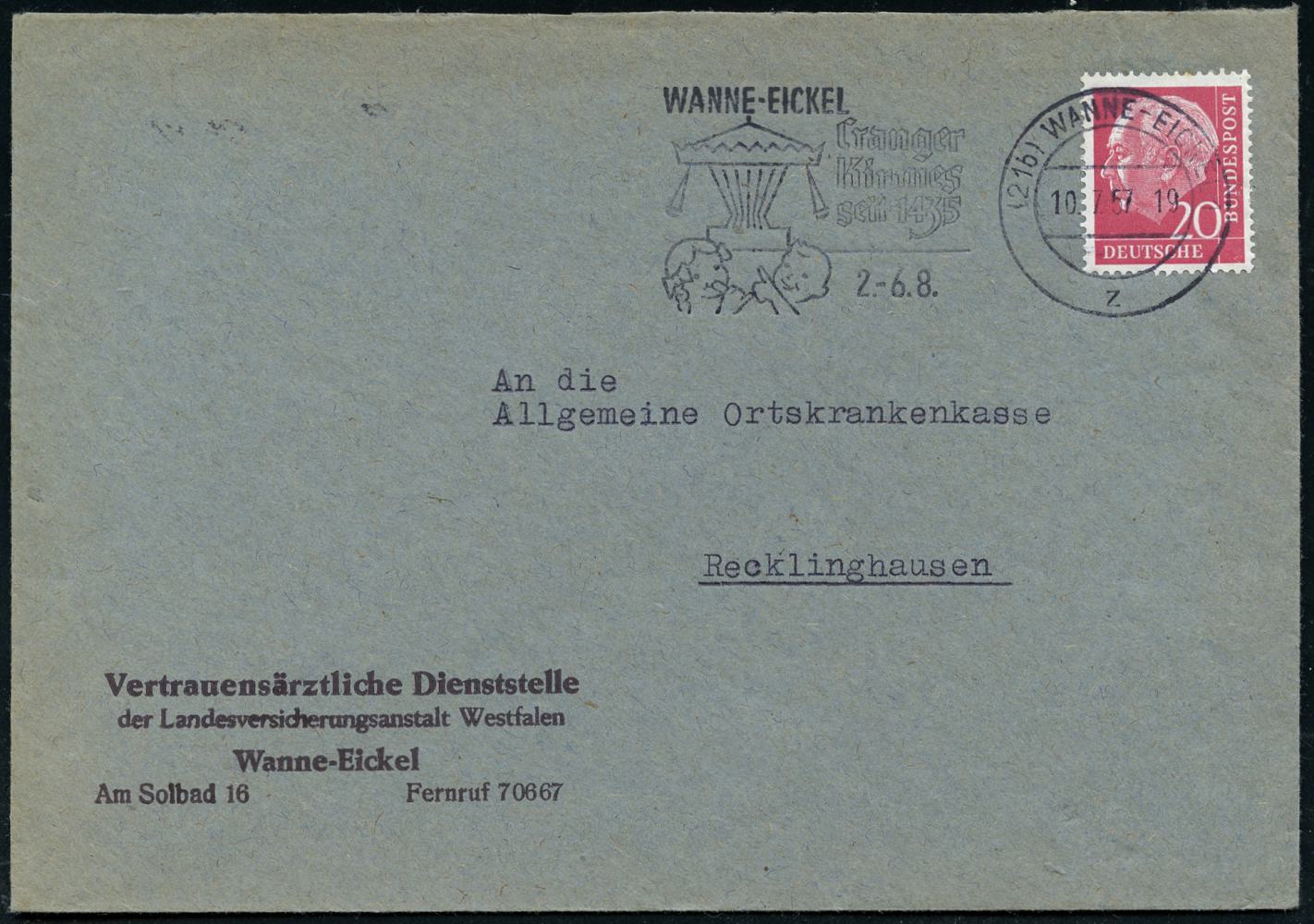 8107 | 15 € | PL-Raum 46.. (ohne Dortmund, Bochum, Gelsenkirchen) : (21b) WANNE-EICKEL 1/ z/ Cranger/ Kirmes/ seit 1435 1957 (10.7.) MWSt (2 Kinder, Karussel) Dienst-Bf.: Vertrauensärztliche Dienststelle der Landesversicherungsanstalt Westfalen.. (Bo.7 A, Erstjahr) | ![]() | |