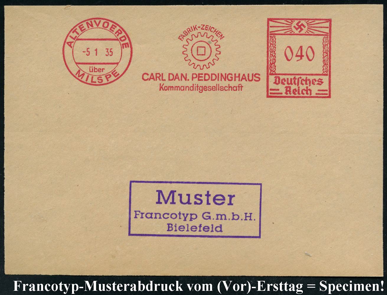 8073 | 35 € | PL-Raum 46.. (ohne Dortmund, Bochum, Gelsenkirchen) : ALTENVOERDE/ über/ MILSPE/ ..CARL DAN.PEDDINGHAUS/ KG 1935 AFS-Musterabdruck Francotyp "Hakenkreuz" = PSt.I-Typ (Logo: Zahnrad) glasklar gest. Francotyp-Musterblatt vom (Vor)-Ersttag !, selten! (Dü.E-3CEo) | ![]() ![]() | |