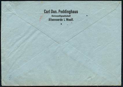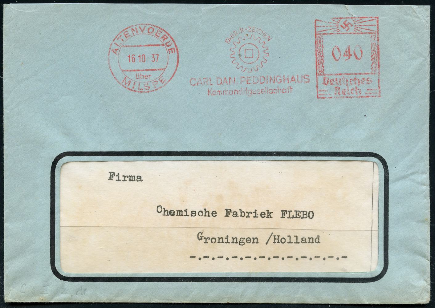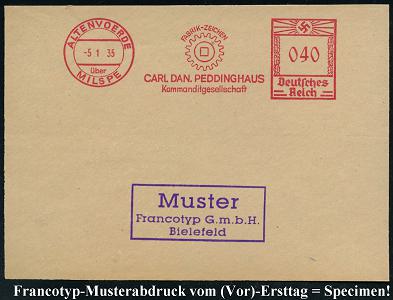 8074 | 20 € | PL-Raum 46.. (ohne Dortmund, Bochum, Gelsenkirchen) : ALTENVOERDE/ über/ MILSPE/ ..CARL DAN.PEDDINGHAUS/ KG 1937 (16.10.) AFS Francotyp "Hakenkreuz" (Zahnrad-Logo) rs. Abs.-Vordruckm Ausl.-Bf., vergl. Katalog-Nr. 8073 u. 8075 (Dü.E-3CEo) | ![]() ![]() | |
