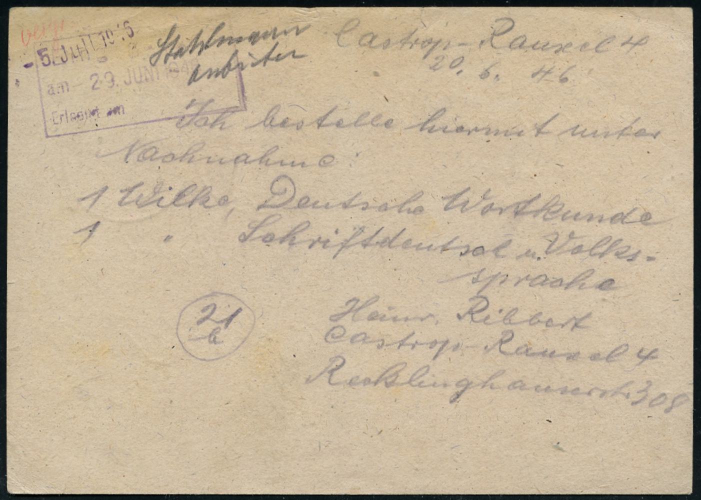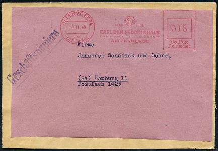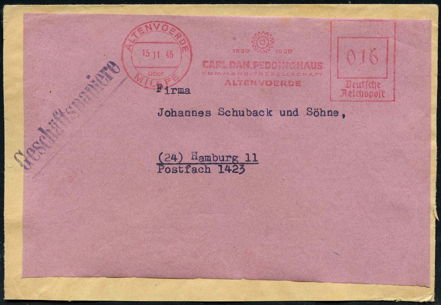 8075 | 25 € | PL-Raum 46.. (ohne Dortmund, Bochum, Gelsenkirchen) : ALTENVOERDE/ über/ MILSPE/ ..CARL DAN.PEDDINGHAUS/ KG 1946 (15.11.) aptierter AFS Francotyp "Reichsadler" = entfernt = Notmaßnahme! , doppelt verwendeter Recycling-Fern-Bf. (kl. Randmäng.) n. Hamburg (Dü.E.13 J-127o) | ![]() | |