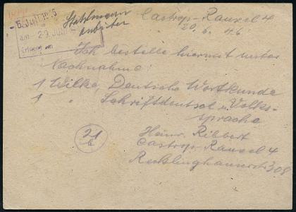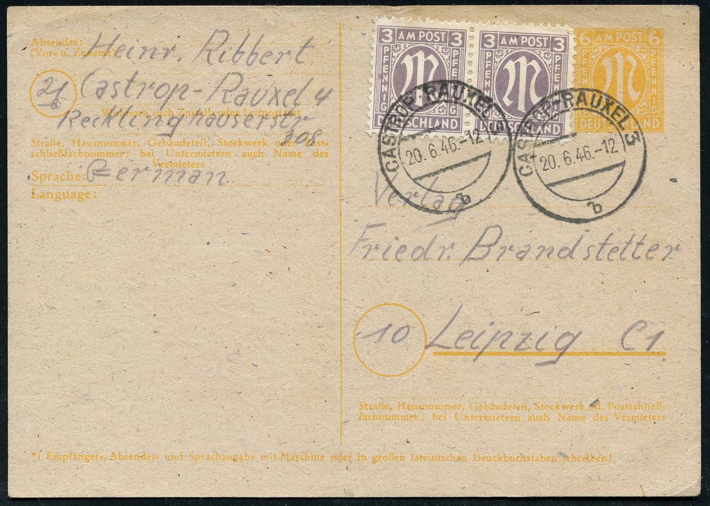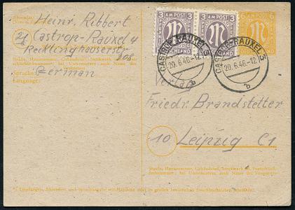 8077 | 18 € | PL-Raum 46.. (ohne Dortmund, Bochum, Gelsenkirchen) : CASTROP-RAUXEL 3/ b 1946 (20.6.) 2K-Steg 2x auf Inl.-P 6 Pf. AM-Post, orange (kl. Randkerbe) + Zusatz-Frankatur 3 Pf. grau, Paar , klar gest. Bedarfs-Fern-Kt. in die SBZ n. Leipzig (Mi.P 905) | ![]() ![]() | |
