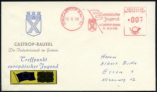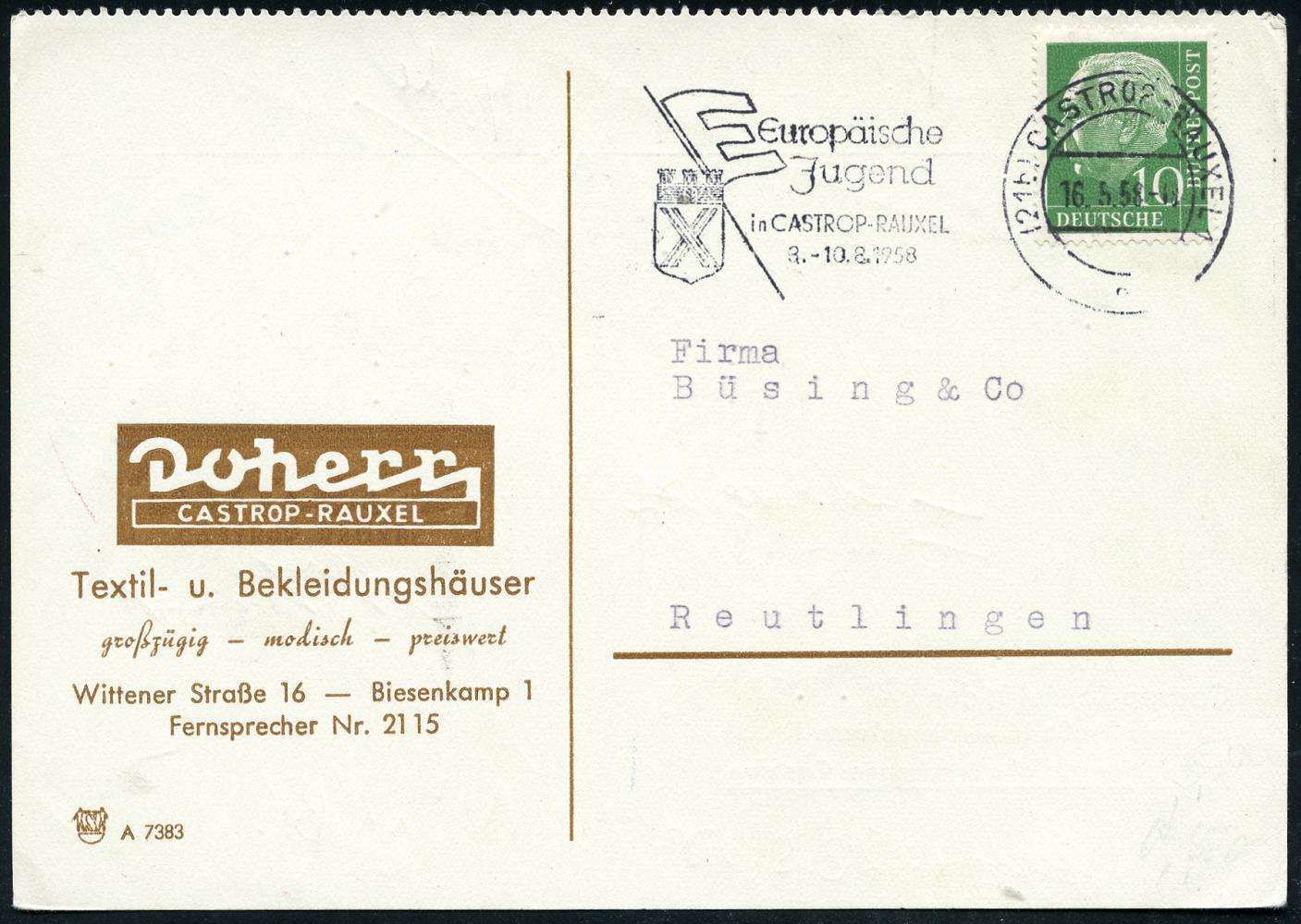 8080 | 15 € | PL-Raum 46.. (ohne Dortmund, Bochum, Gelsenkirchen) : (21b) CASTROP-RAUXEL 1/ n/ Europäische/ Jugend/ ..3.-10.8. 1958 (16.5.) MWSt = alte Europa-Flagge (u. Stadtwappen) auf Firmen-Kz.: Doherr.. Textil- u. Bekleidungshäuser.. (Bo.8 A) | ![]() | |