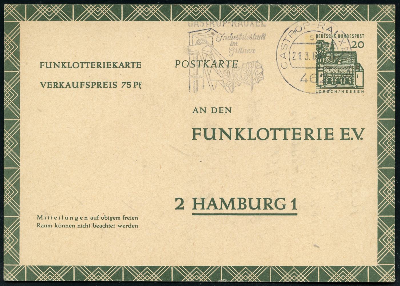 8085 | 16 € | PL-Raum 46.. (ohne Dortmund, Bochum, Gelsenkirchen) : 462 CASTROP-RAUXEL/ sr/ Jndustriestadt/ im/ Grünen 1959 (21.3.) MWSt (Gruben-Förderturm u. Bäume) auf Funklotterie-P 20 Pf. Lorsch, grün (Mi.FP 12) seltene Verwendung! | ![]() ![]() | |