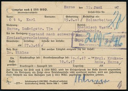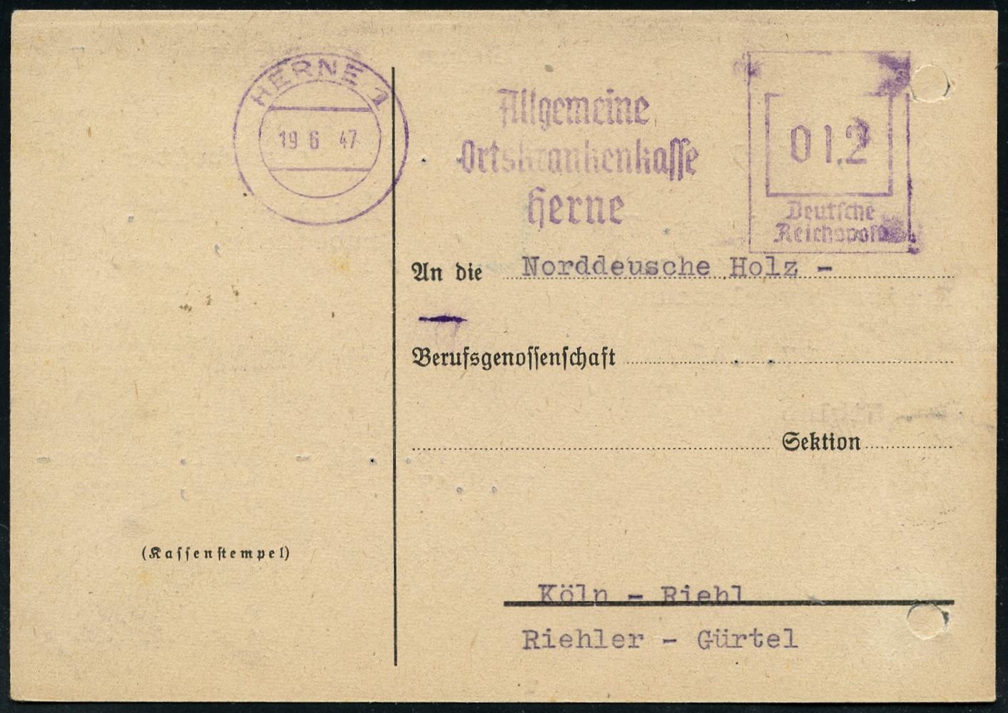 8089 | 20 € | PL-Raum 46.. (ohne Dortmund, Bochum, Gelsenkirchen) : HERNE 1/ Allgemeine/ Ortskrankenkasse.. 1947 (19.6.) l i l a AFS Francotyp "Reichsadler" = entfernt = Notmaßnahme! , Fern-Kt. (rechts Reg.-Lochung geschl.) n. Köln (Dü.E-13 J-129o = unzulässige Farbe!) | ![]() ![]() | |