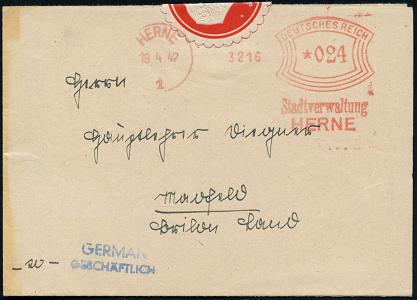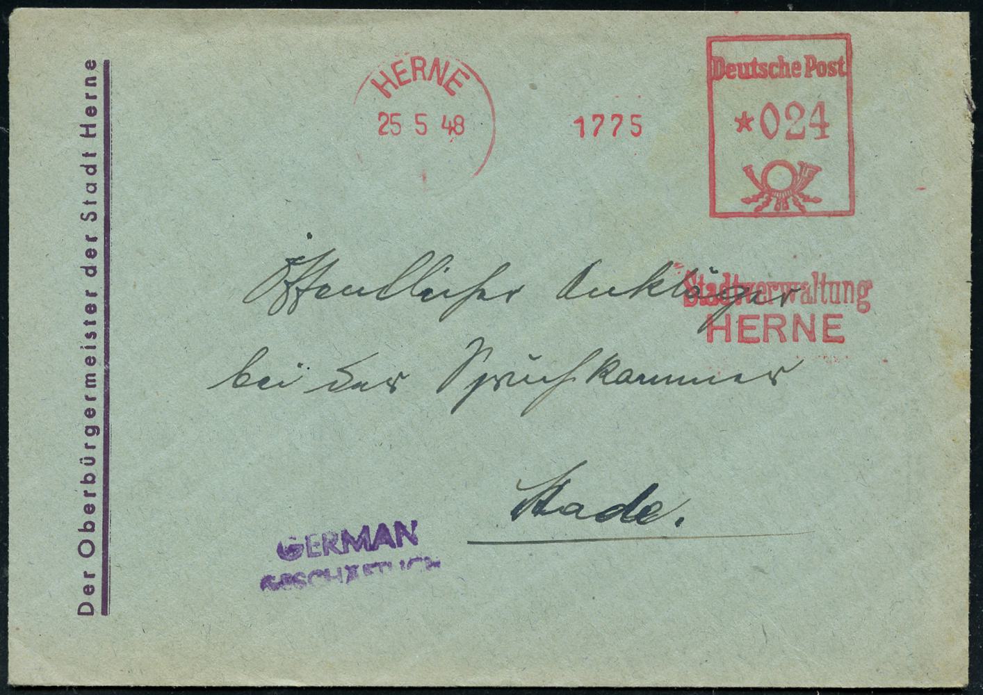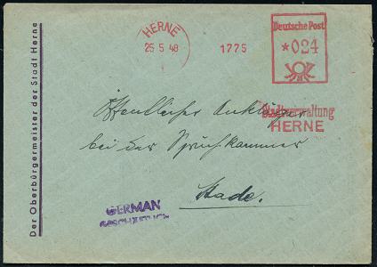 8090 | 16 € | PL-Raum 46.. (ohne Dortmund, Bochum, Gelsenkirchen) : HERNE/ 1/ Stadtverwaltung/ HERNE 1948 (25.5.) ungenormter AFS Francotyp "Posthorn", Absender u n t e r dem Wertrahmen! , Kommunal-Bf.: Der Oberbürgermeister.. (Dü.E-20Am, ungenormt) | ![]() | |