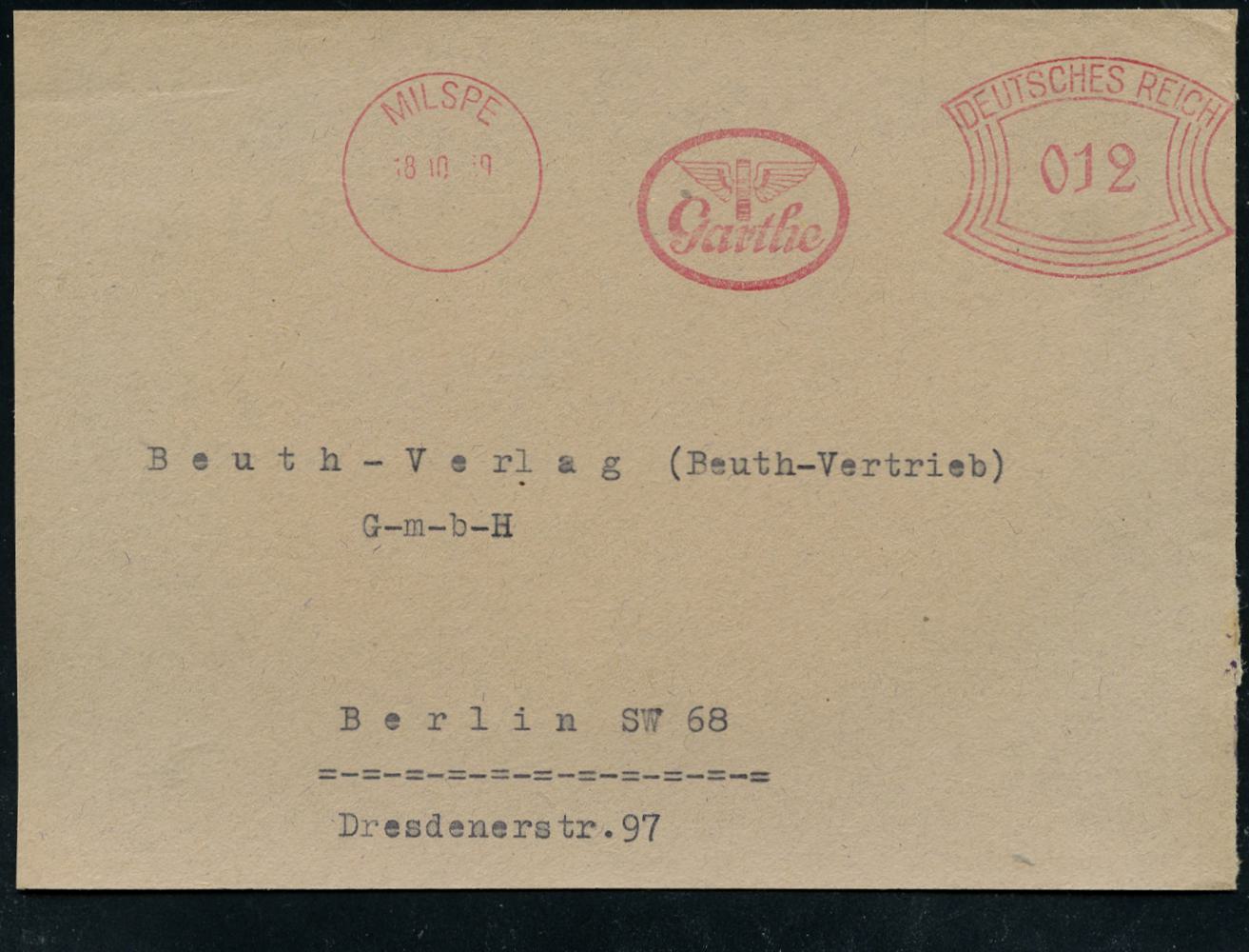 8103 | 14 € | PL-Raum 46.. (ohne Dortmund, Bochum, Gelsenkirchen) : MILSPE/ Garthe 1939 (8.10.) AFS Francotyp "Bogenrechteck" (Flügel-Logo) kleine Bedarfs-Vorderseite (Dü.E-1CEo) | ![]() | |