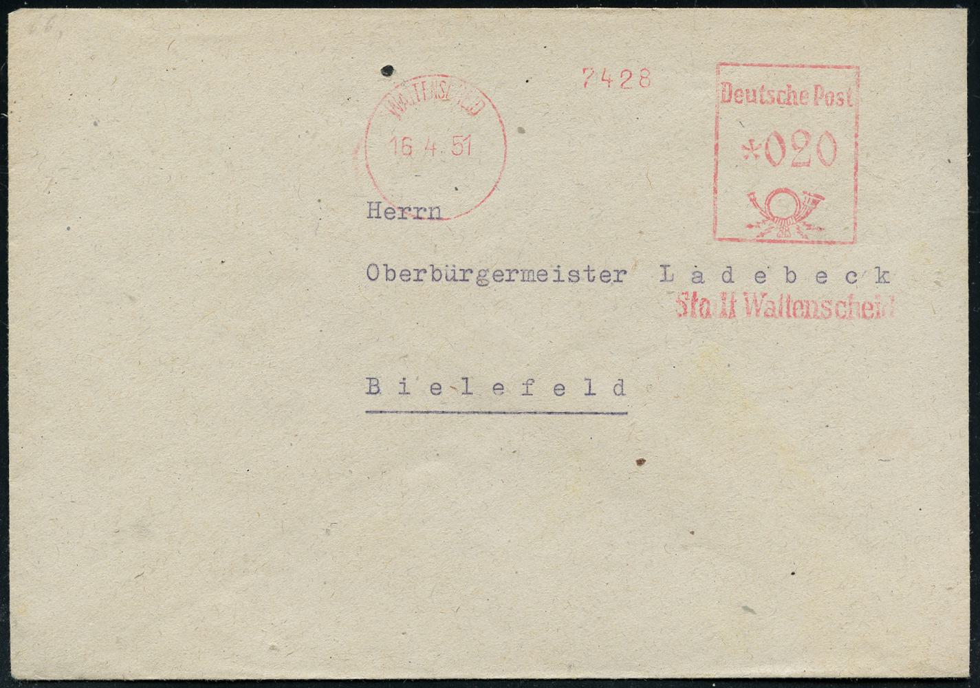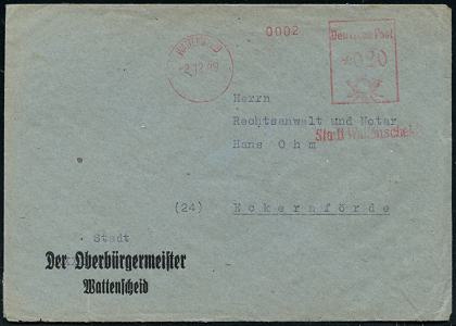 8112 | 18 € | PL-Raum 46.. (ohne Dortmund, Bochum, Gelsenkirchen) : WATTENSCHEID/ Stadt Wattenscheid 1949 (2.12.) ungenormter AFS Francotyp "Posthorn" mit Absenderklischee unter dem Wertrahmen u. alte Zählnr. "0002" , Dienst-Bf.: Der Oberbürgermeister.. (Dü.E-20Ah, ungenormt!) | ![]() | |