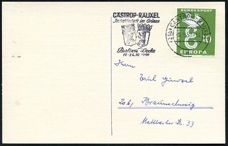 8083 | 14 € | PL-Raum 46.. (ohne Dortmund, Bochum, Gelsenkirchen) : (21b) CASTROP-RAUXEL 1/ n/ ..Berliner Woche 1959 (5.10.) MWSt (beide Stadtwappen) EF 10 Pf. Europa, Inl.-Karte (Bo.9 A) | ![]() | |