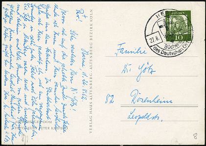 8092 | 15 € | PL-Raum 46.. (ohne Dortmund, Bochum, Gelsenkirchen) : HERNE/ Bücherei/ des deutschen Ostens 1962 (27.8.) aptierter HWSt = alte PLGZ entfernt (Kreuzritterschild + Bücher) Color-Foto-Ak.: Altenberger Dom, Bedarf (Bo.8 aptiert) | ![]() ![]() | |
