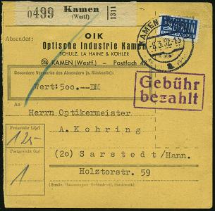 8096 | 18 € | PL-Raum 46.. (ohne Dortmund, Bochum, Gelsenkirchen) : KAMEN (WESTF)/ a 1952 (8.3.) 2K-Steg auf 2 Pf. NoB + viol. Ra.2: Gebühr/bezahlt , klar gest. Inl.-Paketkt.: OIK Optische Industrie Kamen / SCHULZ, LA HAINE & KÖHLER n. Sarstedt | ![]() | |