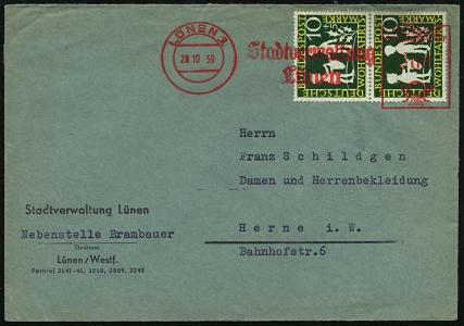8100 | 20 € | PL-Raum 46.. (ohne Dortmund, Bochum, Gelsenkirchen) : LÜNEN 1/ Stadtverwaltung 1959 (2.10.) AFS Francotyp in 000 als Vorausentwertung auf Paar 10 Pf. Wofa (Sternthaler) , ungewöhnlicher Kommunal-Fernbf. n. Herne, seltene Verwendung! (Mi.323 MeF, + 10.- EUR) | ![]() | |