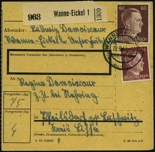 8105 | 16 € | PL-Raum 46.. (ohne Dortmund, Bochum, Gelsenkirchen) : WANNE-EICKEL 1/ l 1943 (28.9.) 2K-Steg auf 15 Pf. u. 60 Pf. Hitler + schw. Paketzettel: Wanne-Eickel 1 , Inl.-Paketkt. n. Pfeilsdorf (Mi.789, 797) | ![]() | |
