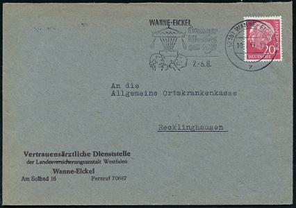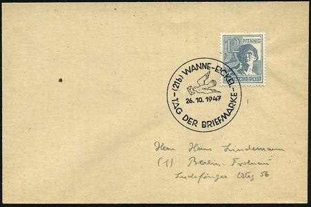 8106 | 12 € | PL-Raum 46.. (ohne Dortmund, Bochum, Gelsenkirchen) : (21b) WANNE-EICKEL/ TAG DER BRIEFMARKE 1947 (26.10.) SSt = Brieftaube , klar gest. Inl.-Bf. (Bo.1) | ![]() | |