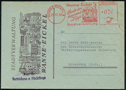 8109 | 16 € | PL-Raum 46.. (ohne Dortmund, Bochum, Gelsenkirchen) : WANNE-EICKEL 1/ Stadt d./ tausend/ Züge/ Stadtverwaltung 1960 (28.10.) AFS Francotyp (Dieseltriebwagen, Signal) + viol. Abs.-2L: Amt für/ Vertriebene u. Flüchtlinger auf illustriertem Kommunal-Bf. (Dü.E-23DO) | ![]() | |
