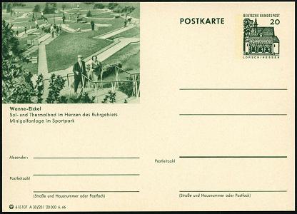 8110 | 7 € | PL-Raum 46.. (ohne Dortmund, Bochum, Gelsenkirchen) : Wanne-Eickel 1966 20 Pf. BiP Lorsch, grün: Minigolfanlage im Sportpark , ungebr. (Mi.P 89-A 30/231) | ![]() | |