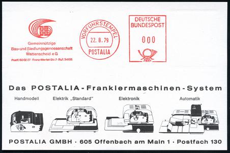 8114 | 18 € | PL-Raum 46.. (ohne Dortmund, Bochum, Gelsenkirchen) : Wattenscheid 1979 (22.8.) AFS.: VORFÜHRSTEMPEL/POSTALIA/ Gemeinnützige Bau- u. Siedlungsgenossenschaft Wattenscheid eG.. (Backstein-Logo) seltene Postalia-Muster-Kt. (= Specimen) | ![]() | |