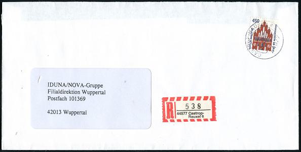8086 | 14 € | PL-Raum 46.. (ohne Dortmund, Bochum, Gelsenkirchen) : 44577 CASTROP-RAUXEL 6/ e 1995 (5.4.) 1K-Segment auf EF 450 Pf. Bauwerke + RZ: 44577 Castrop-/Rauxel 6 , Fern-R-Bf. (Mi.1623 EF + 10.- EUR) | ![]() | |
