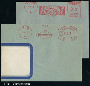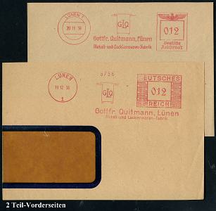 8097 | 25 € | PL-Raum 46.. (ohne Dortmund, Bochum, Gelsenkirchen) : LÜNEN/ 1/ GLQ/ Gottfr.Quitmann../ Metall-u.Lackierwaren-Fabrik 1936/39 2 verschiedene AFS Francotyp "Mäanderrechteck" bzw. "Reichsadler" (je Monogr.-Logo) 2 Teil-Vorderseiten (Dü.E-2CEh, e-5CEo) | ![]() | |
